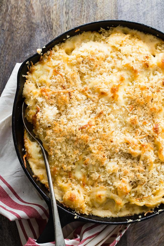 Melt 3 Tablespoons butter and toss well with the panko bread crumbs. Sprinkle buttered panko reserved 1/3 cup grated cheese over the pasta. Cover with foil and bake for 30-40 minutes or until the sauce is bubbling. Remove cover and bake 10-15 minutes until top is brown and sides are crusty. Remove from oven and rest for 5-10 minutes before serving.