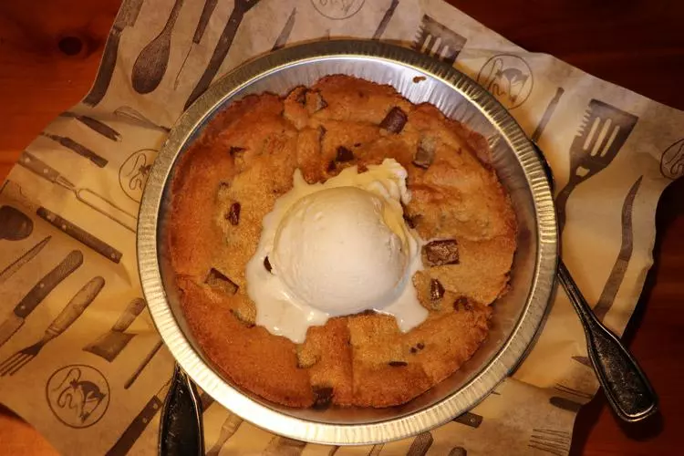 To wrap our dinner up, we chose to split a dessert. With options ranging from Spiced Carrot Cake to Sky-High Mud Pie, and a Lemon Poppyseed Cake we chose the Chocolate Chip Cowboy Cookie. It's served in a pie tin with a heaping scoop of vanilla ice cream on top.
