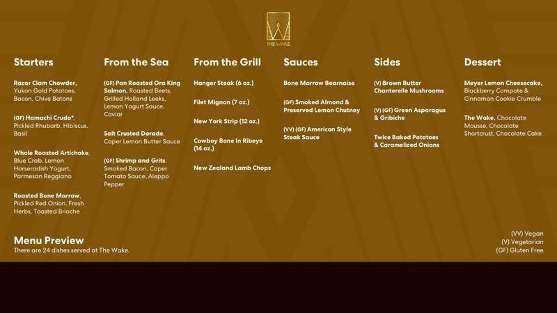 You're sure to find a treat on the menu with everything from filet Mignon, New York strip, and New Zealand lamb chops. From the sea you can enjoy shrimp & grits, pan roasted Ora King salmon, and salt crusted dorado.