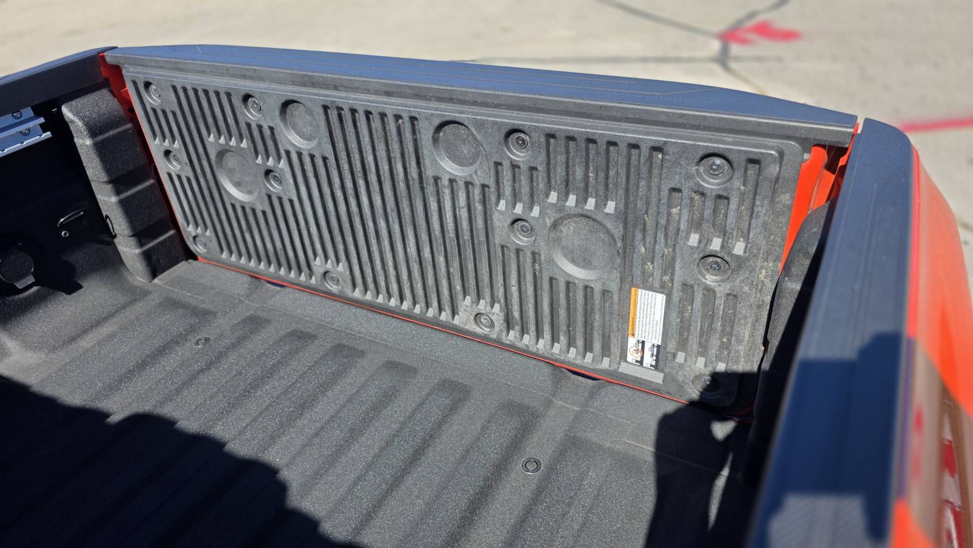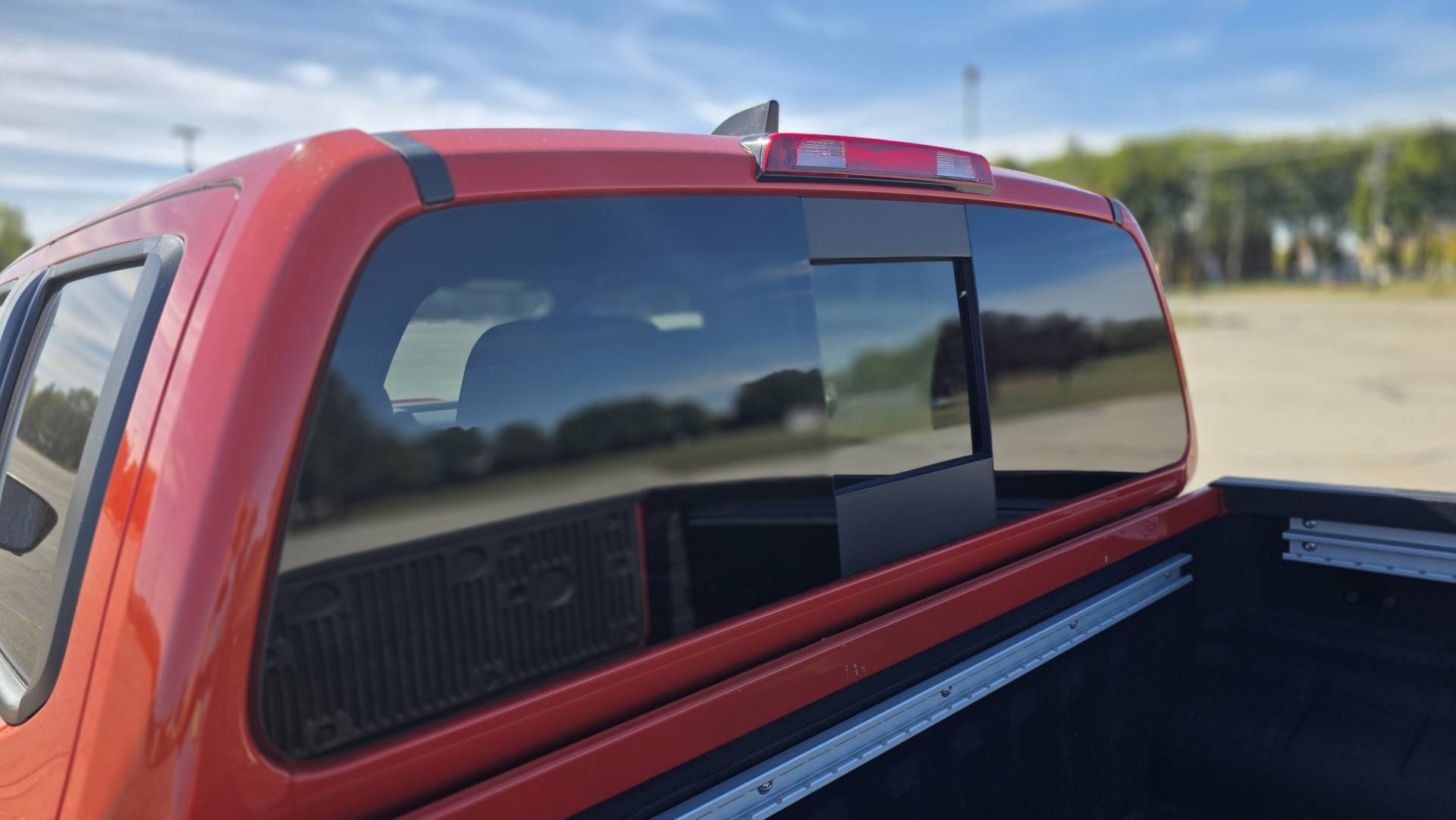The standard sliding rear window improves cab ventilation, and there's a sunglasses holder in the overhead console - small touches that matter during real use. An available 120-volt power outlet in the bed means you can charge tools or run equipment without a separate generator.