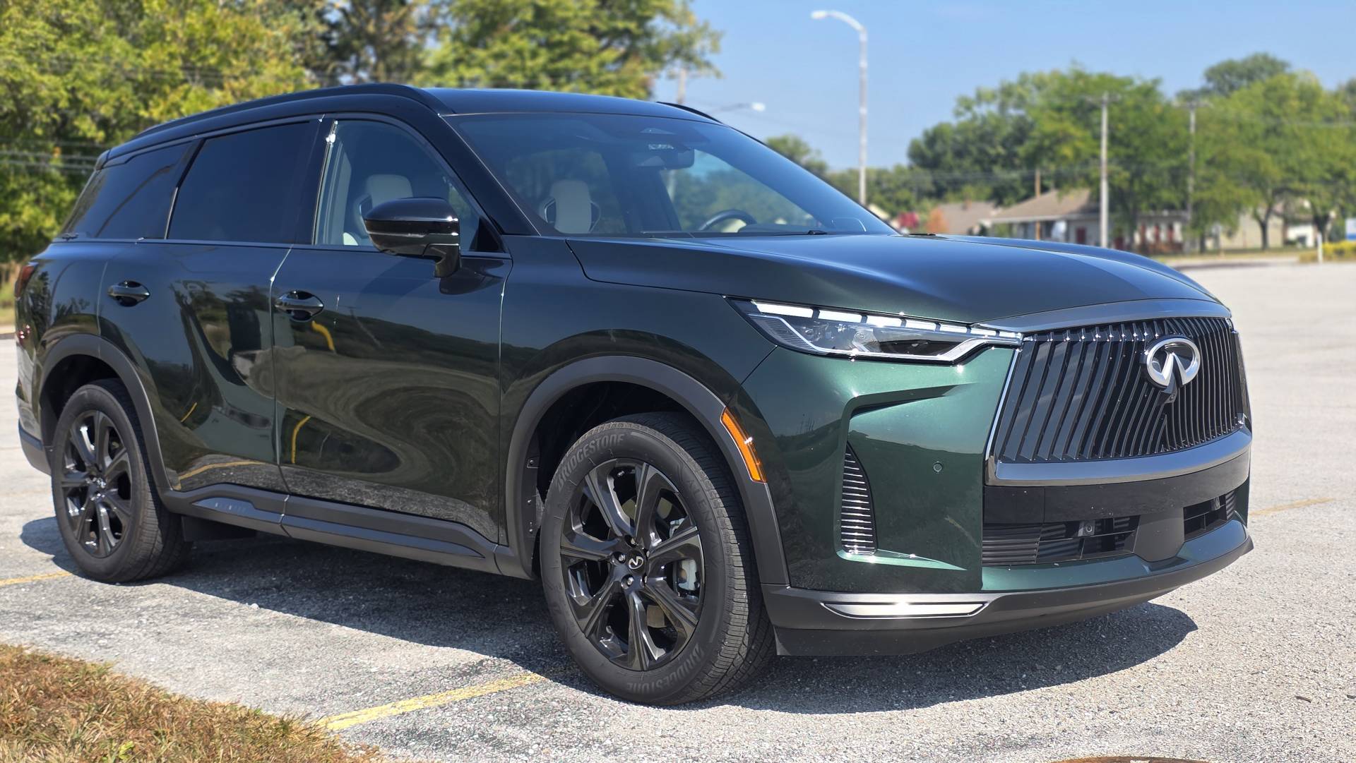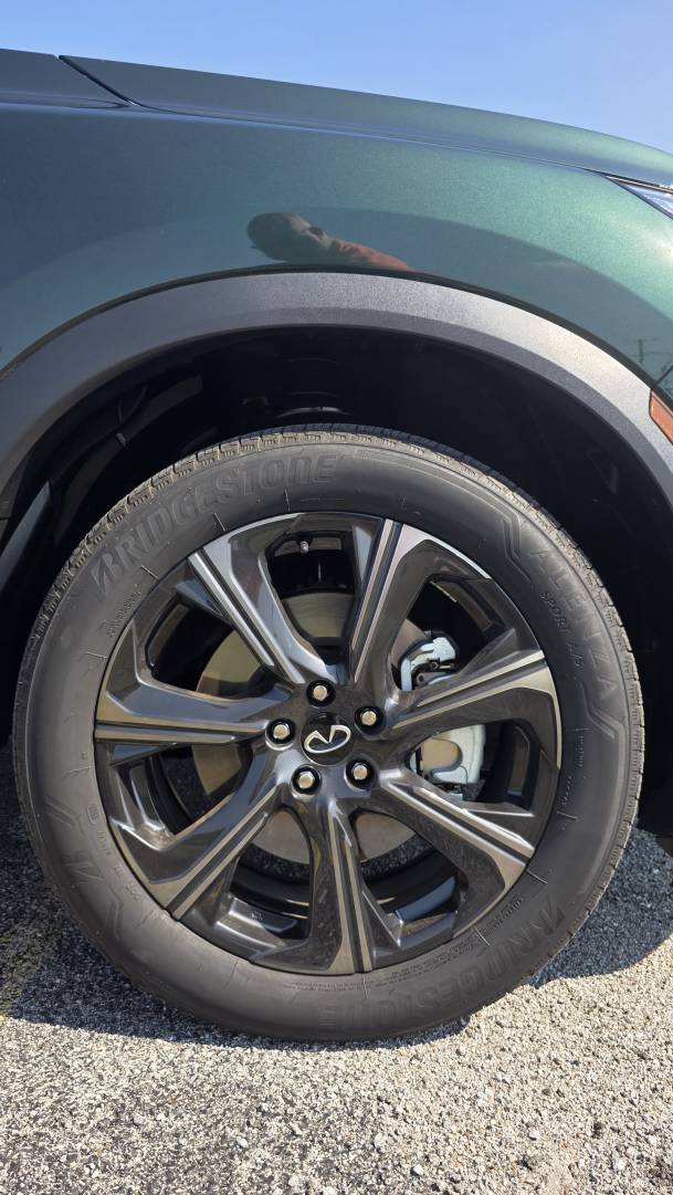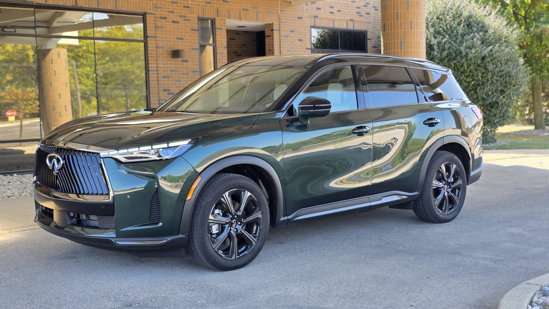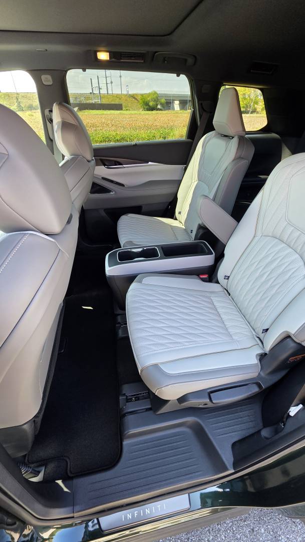 If you've driven a Pathfinder, you already understand the QX60's architecture. Same platform, familiar seating position, similar sight lines. The difference is what Infiniti has done on top of that foundation. The steering wheel is wrapped in leather that holds its character. The seats - quilted semi-aniline with massage function and 8-way power adjustment in the Emerald Green and Stone Gray Autograph I drove - earn their keep on a long stretch. My wife Heather would have been more than comfortable in the heated and ventilated second-row captain's chairs. That's the kind of thoughtful detail that separates this from its mainstream sibling.