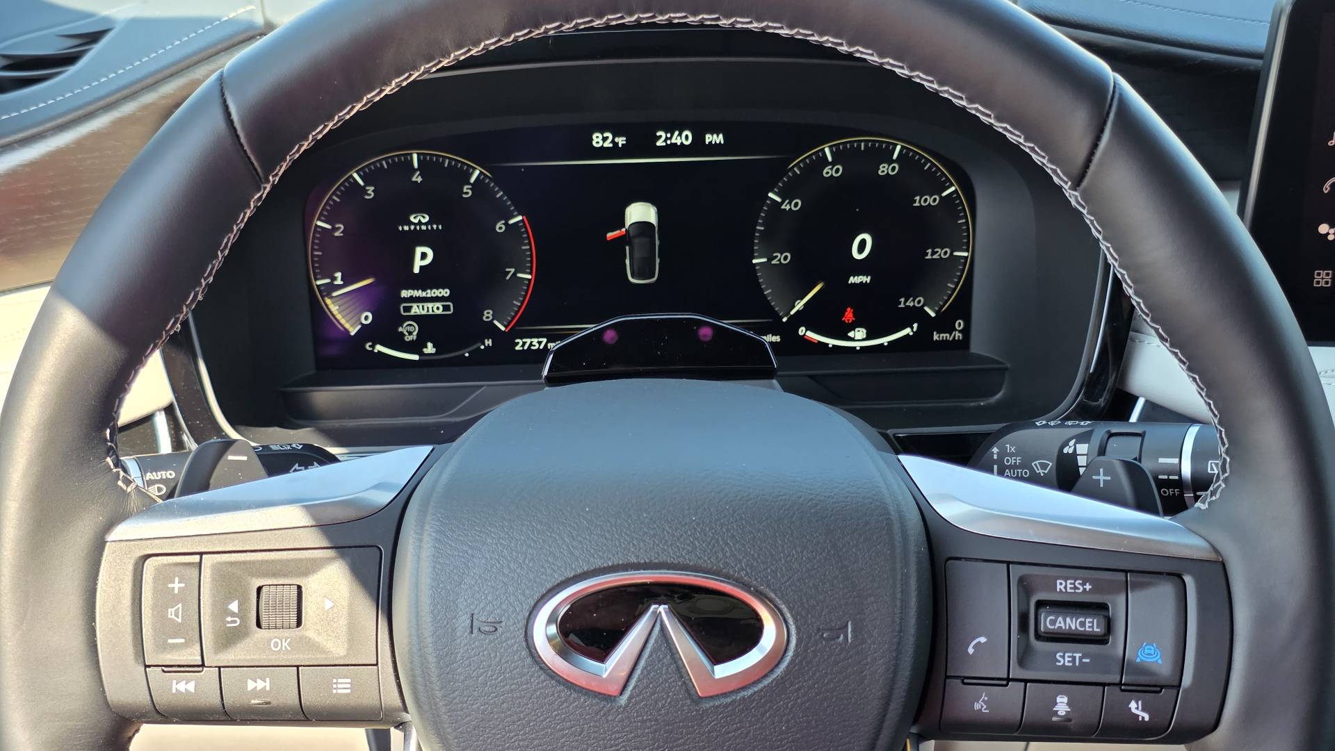 ProPilot Assist 2.1 handles steering, braking, and acceleration on compatible highways fully hands-free. On I-94 it managed lane position cleanly and without drama. The 10.8-inch head-up display keeps speed and navigation visible without pulling eyes from the road, which matters when you're letting the assist system handle the miles.